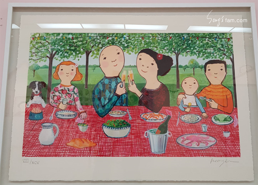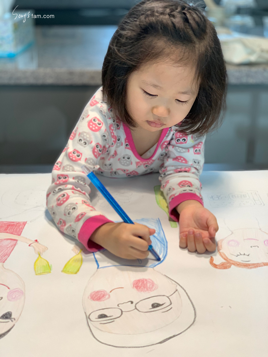 아무튼 엄마의 처음 생각과는 다른 형태가 되었지만 에바 알머슨 스타일의 우리가족 그림이 완성되었다.