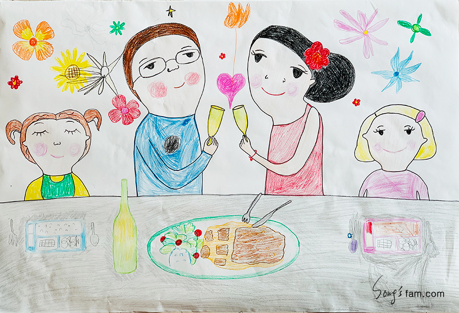 이번에는 "행복을 그리는 화가" 에바 알머슨의 그림 중 "Dinner"을 흉내내어 우리가족을 그려 보았다.
