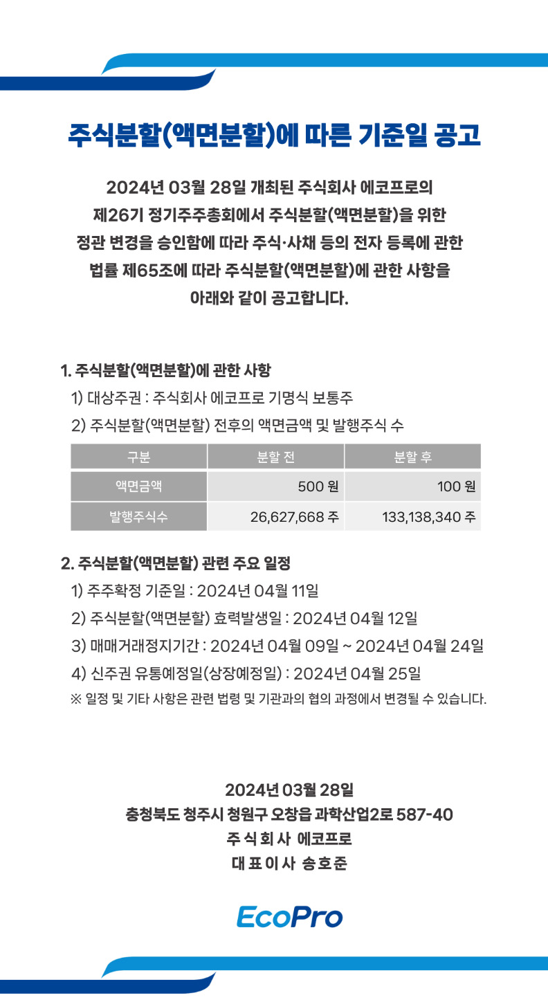 에코프로에서는 최근 주식분할에 관한 결정을 내렸습니다. 이에 따라 기존에 공지된 일정에 일부 변경사항이 있어서 이를 공지합니다.