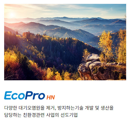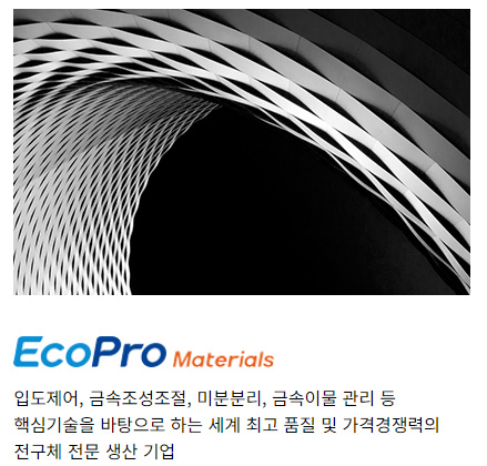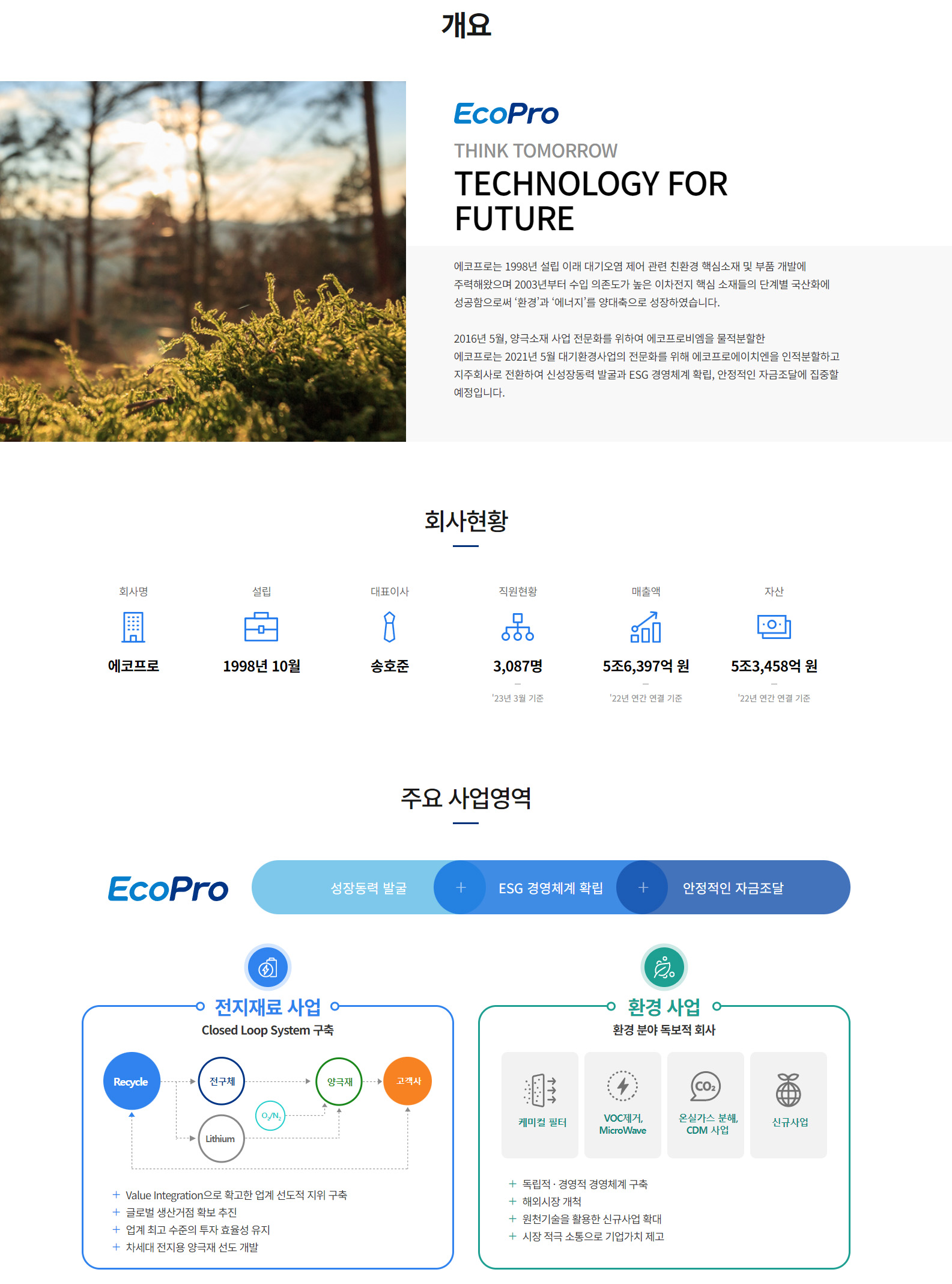 에코프로는 1998년 설립 이후 대기오염 제어 관련 친환경 핵심소재 및 부품 개발에 주력해왔습니다. 2003년부터는 수입 의존도가 높았던 이차전지 핵심 소재들의 국산화에 성공하여 '환경'과 '에너지'를 중심으로 성장하였습니다.