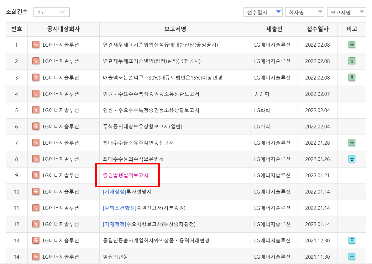 검색 결과에서 증권발행실적보고서를 클릭한다.