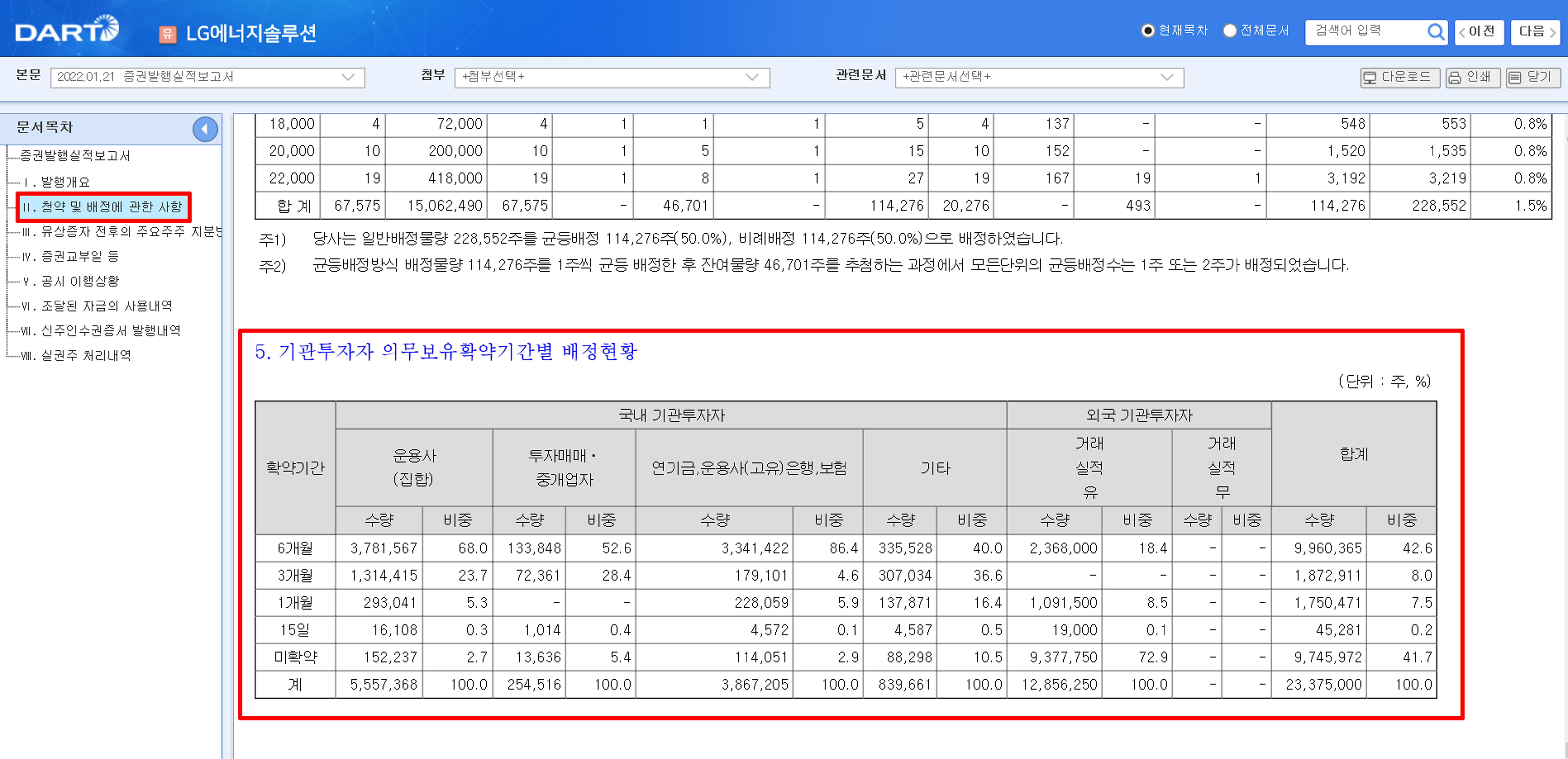 왼쪽의 문서목차에서 ⅱ. 청약 및 배정에 관한 사항을 클릭하면 오른쪽과 같은 내용을 볼 수 있는데...제일 하단으로 내려보면 5. 기관투자자 의무보유확약기간별 배정현황 을 볼 수 있다.
