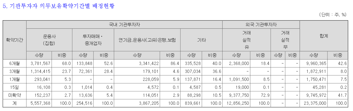 IPO기업공개로 상장한 기업들은 국내 기관투자자들과 외국인 기관투자자들에게는 의무보유확약기간이 주어진다.