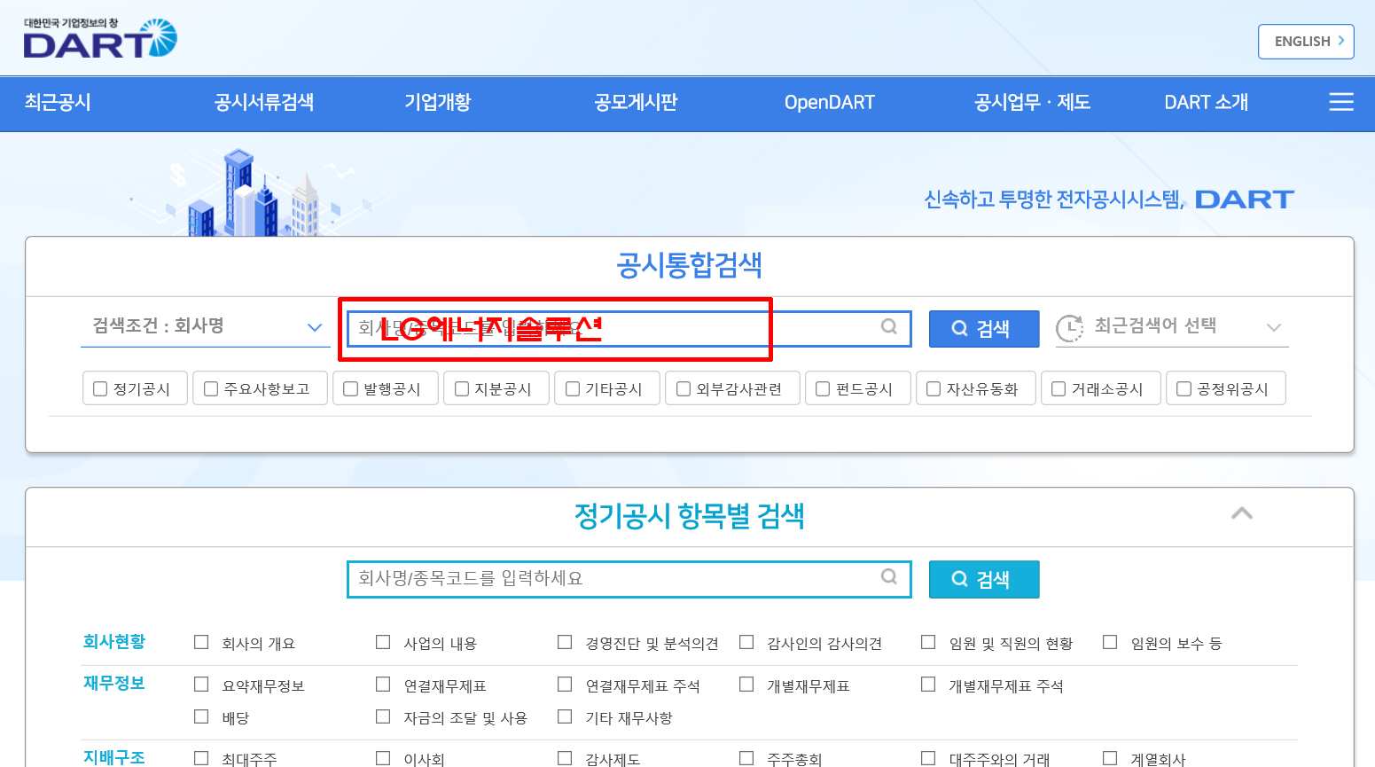 다트 홈페이지에서 공시통합검색란에서 LG에너지솔루션을 입력하고 검색한다.