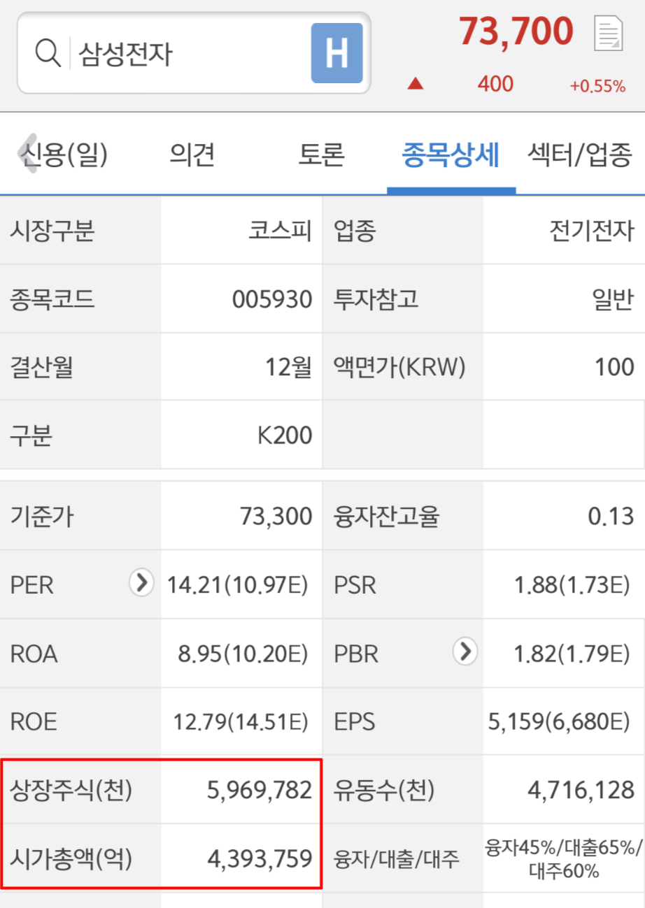 현재 73,700원에 거래되고 있고, 있지만, 전날 종가인 73,300원으로 계산하여 시가총액이 산출되어 있다.
