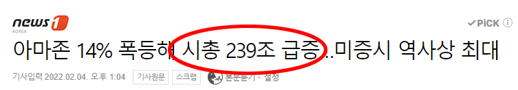 아마존 주식이 한 주당 14% 폭등하면서 아마존의 총 시가총액이 239조원 급등했다는 뉴스이다. 여기서 시가총액은 무엇일까?