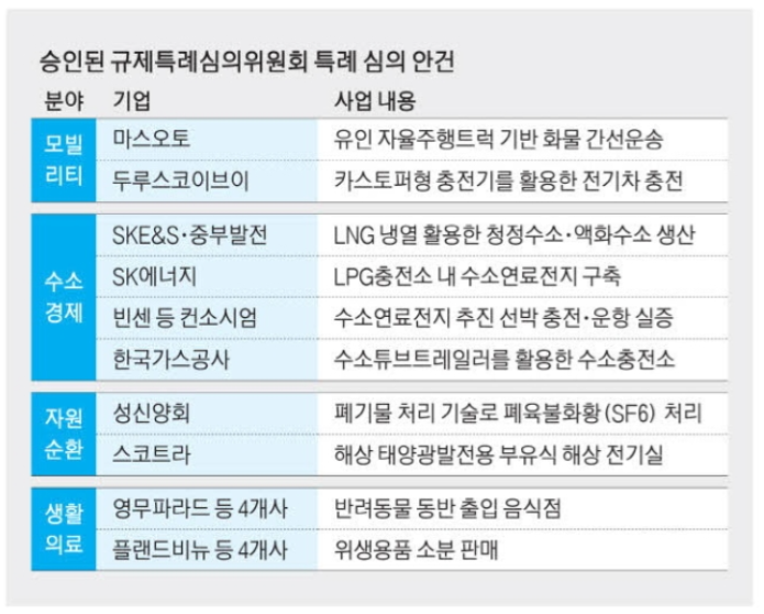 SK에너지는 기존에 운영하던 액화석유가스(LPG) 충전소 내에 수소연료전지를 구축하는 샌드박스 실증특례를 받았다. 현행 액화석유가스법에는 LPG충전소 내에 설치할 수 있는 건축물과 시설을 제한하고 있어 수소연료전지 설치가 불가능했다. LPG충전소가 수소도 충전하고, 수소로 발전해 전기도 판매하는 시설로 탈바꿈하지 못하게 막는 낡은 규제였다. 규제심의위는 안전성 확보를 조건으로 수소연료전지 설치가 가능하도록 실증특례를 승인했다. SK에너지는 수도권 LPG충전소에 수소연료전지를 시범적으로 도입할 계획이다.
