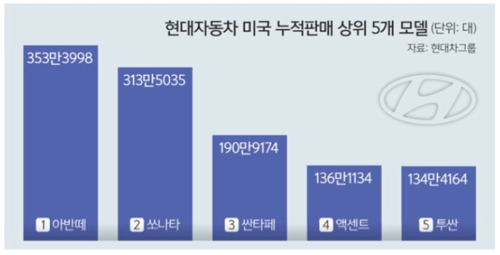 현재까지 미국 시장에서 가장 많이 팔린 현대차 모델은 ‘아반떼’(현지명 엘란트라)다. 1991년 미국 판매를 시작해 올해 12월까지 353만3998대가 판매됐다. 전체 판매량 가운데 23.6%를 차지했다. ‘쏘나타’가 313만5035대로 누적 판매 비중 20.9%를 기록하며 뒤를 이었다. 또 ‘싼타페’가 190만9174대로 12.7%, ‘엑센트’가 136만1134대로 9.1%, ‘투싼’이 134만4164대로 9.0%를 차지하며 ‘톱5’에 이름을 올렸다.