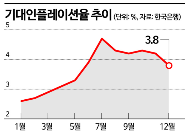 한국은행이 27일 발표한 '12월 소비자동향조사' 결과에 따르면 기대인플레이션율은 11월(4.2%)보다 0.4%포인트 낮은 3.8%로 집계됐다. 기대인플레이션율이 3%대로 내린 것은 지난 6월(3.9%) 이후 처음이며, 지난 5월(3.3%) 이후 가장 낮았다.