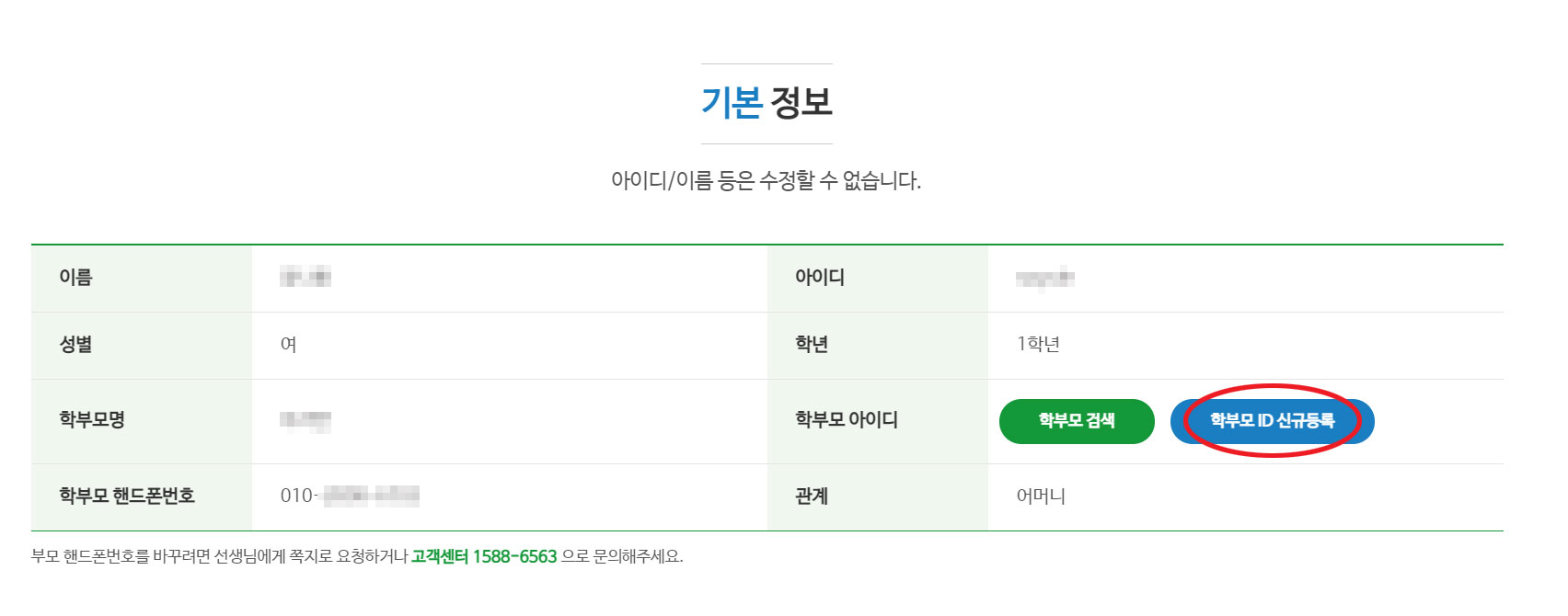 기본정보에서 우측의 학부모ID신규등록을 클릭해 준다.
