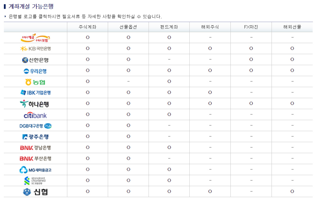 키움증권 홈페이지에 들어가면 위와 같이 계좌개설이 가능한 은행을 찾아 볼 수 있다.