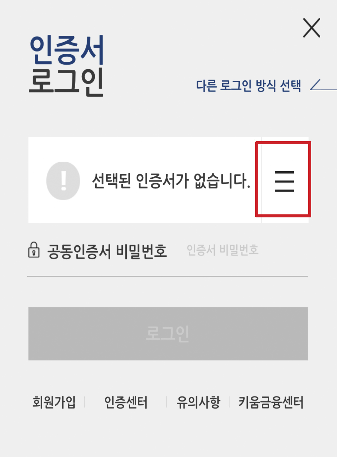 빨간박스 안 삼선을 클릭하면 현재 등록되어 있는 인증서를 확인 할 수 있다.