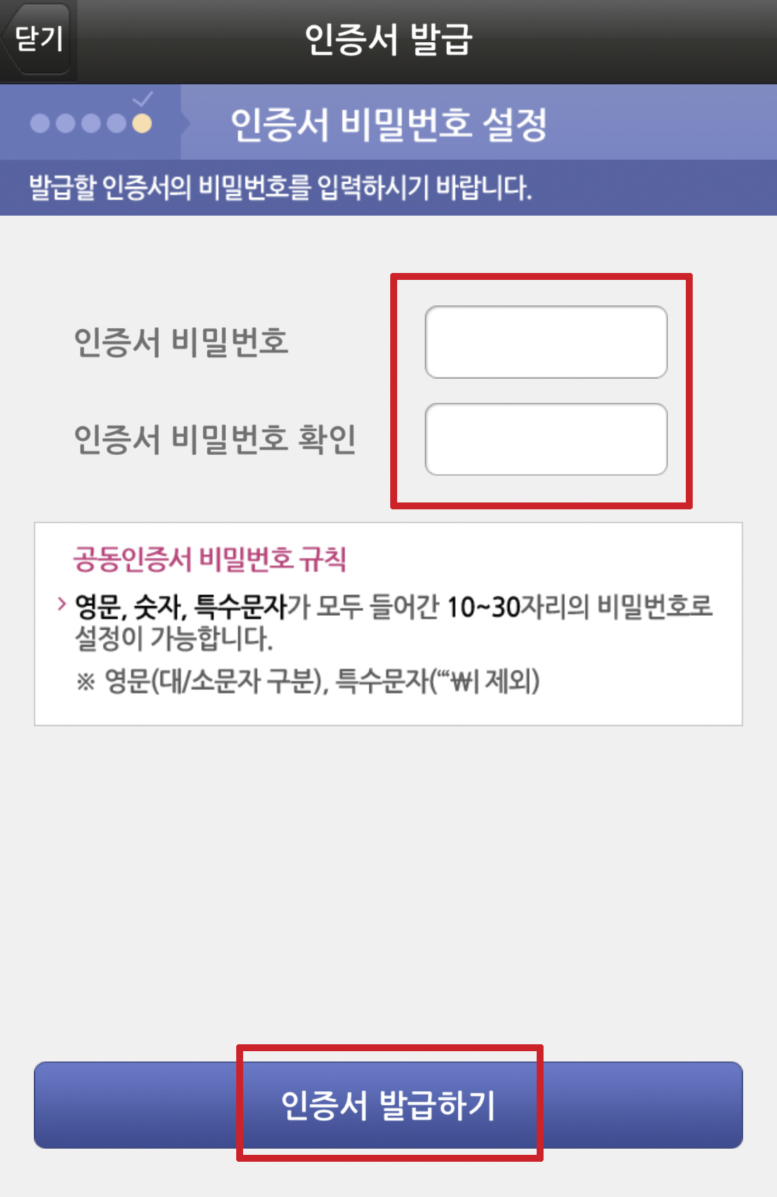 인증서 비밀번호는 영문(대/소문자 구분), 숫자, 특수문자를 포함하여 10~30자리로 설정해 준다.