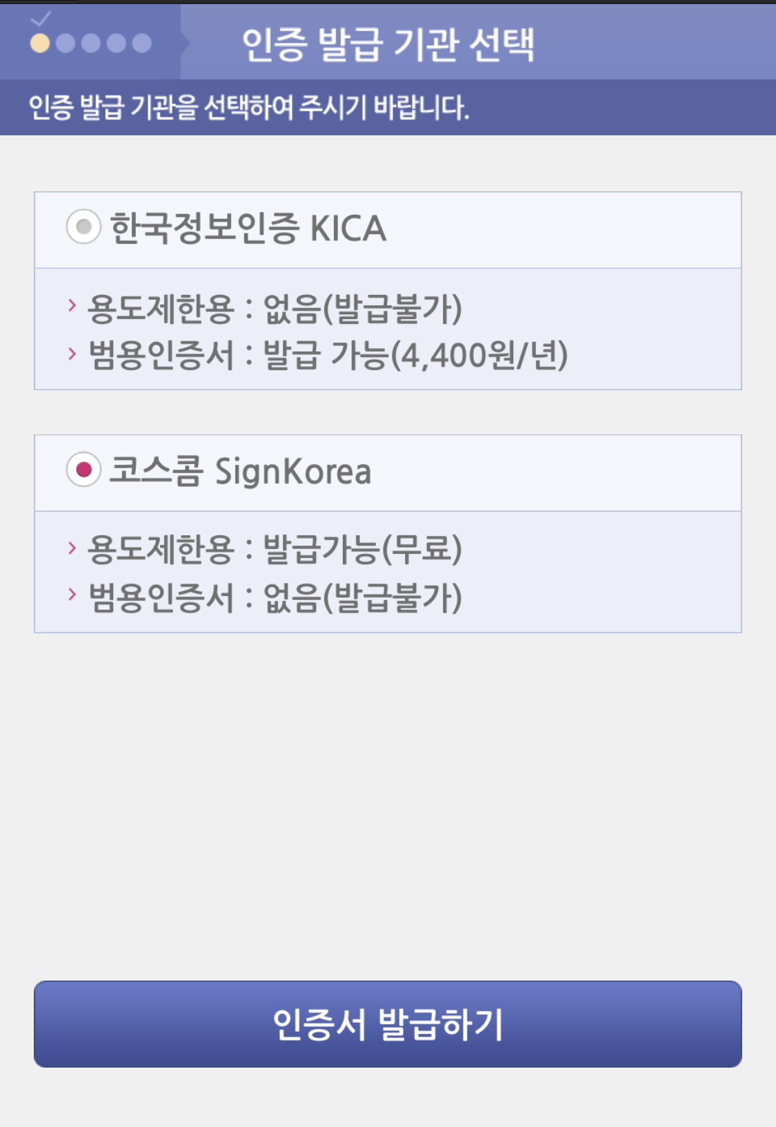 일반적으로 무료로 발급 가능한 코스콤 인증서를 선택한다.