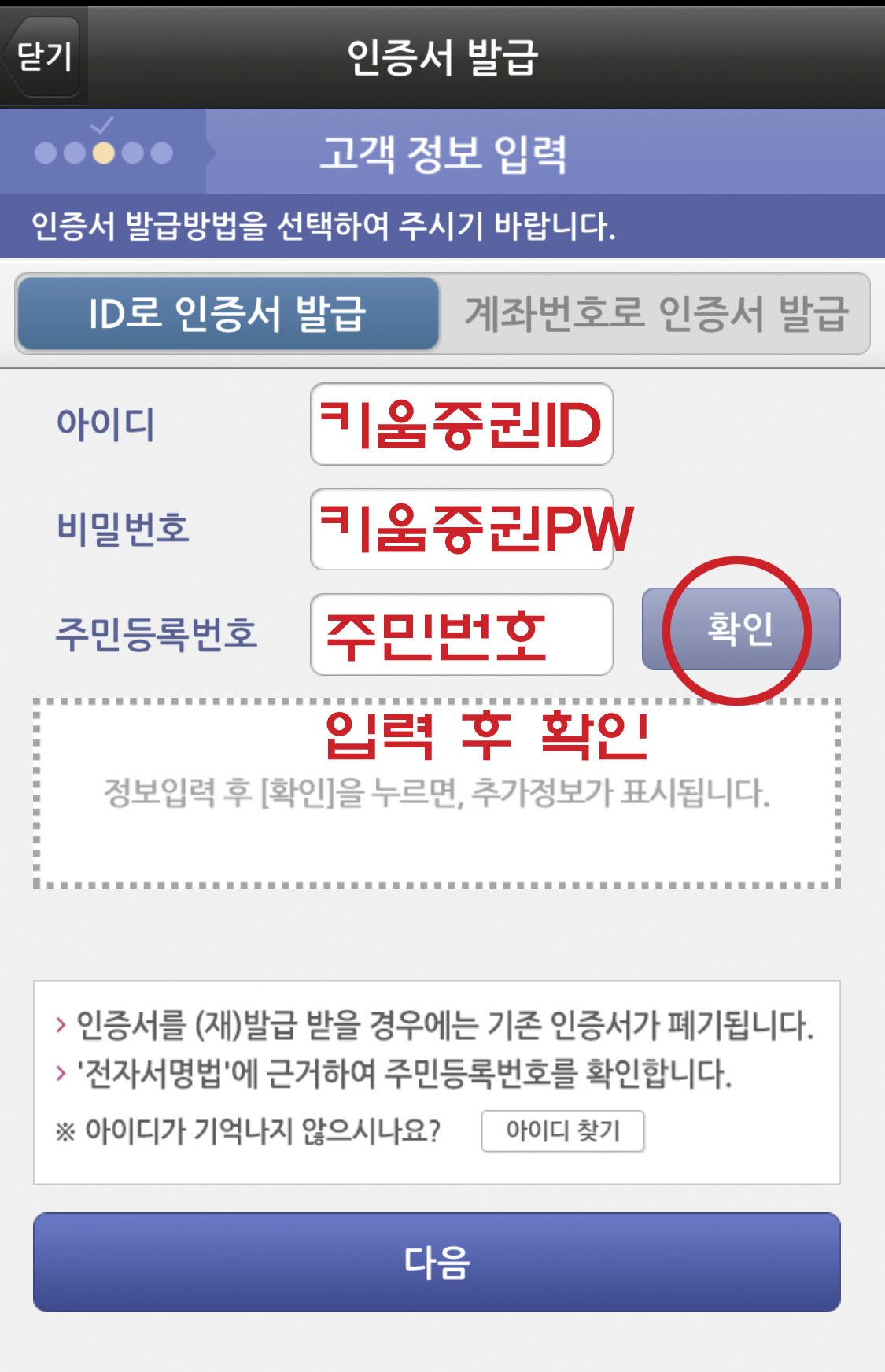 키움증권의 아이디와 비밀번호, 주민등록 번호를 입력 후 확인을 클릭한다.