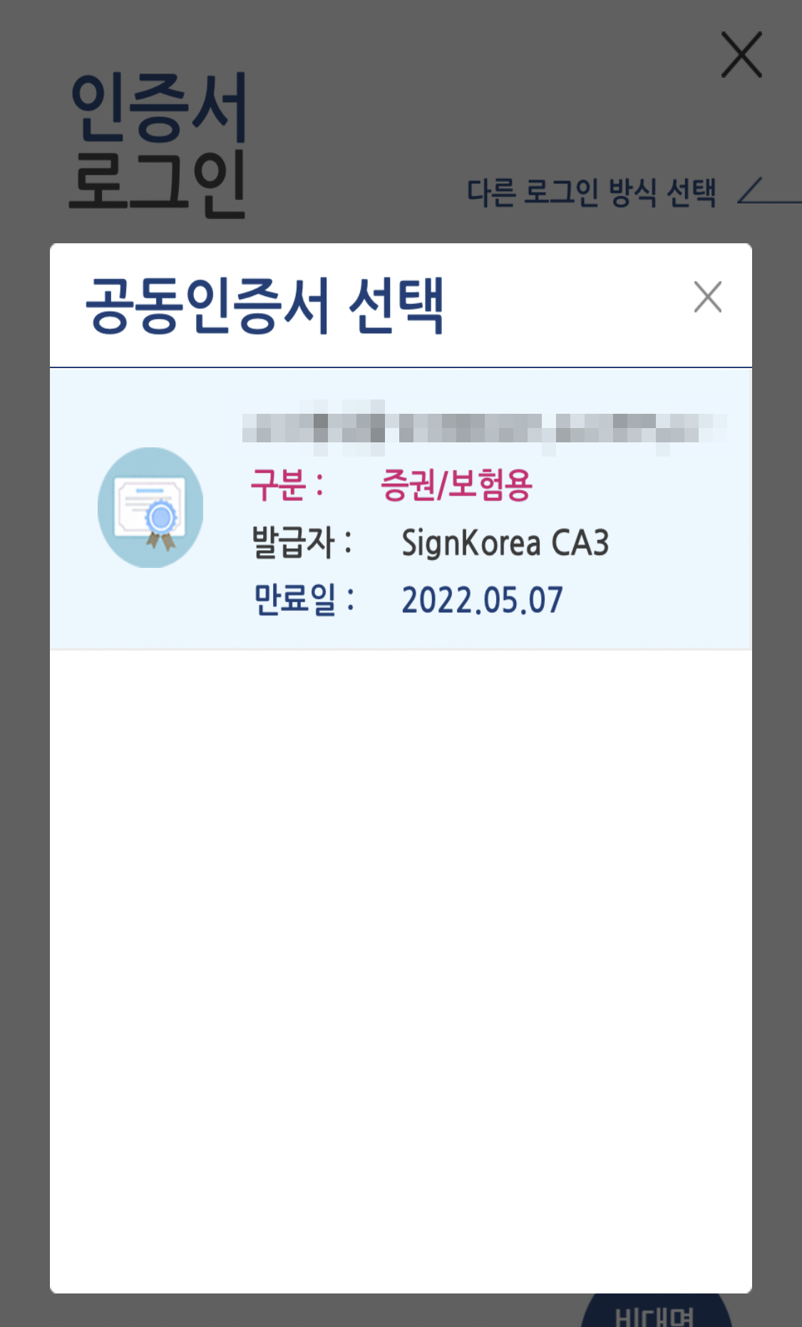 (예, 유안타증권, 삼성증권 등 증권사에서 발행한 인증서가 있다면 홈페이지에서 타행인증서 등록 후 사용가능)