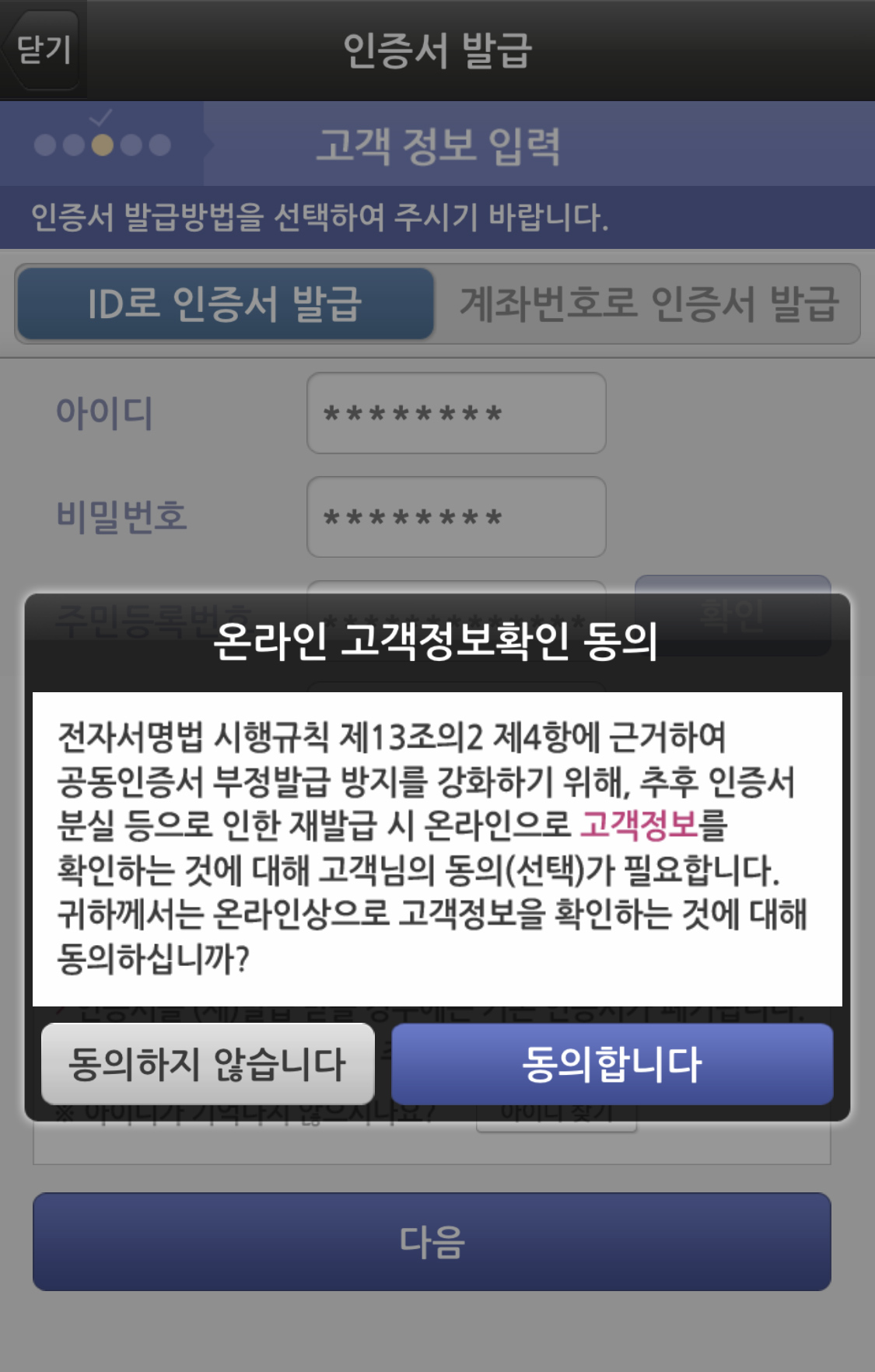 온라인 고객정보확인 동의 내용을 확인 하고 "동의합니다"를 클릭한다.