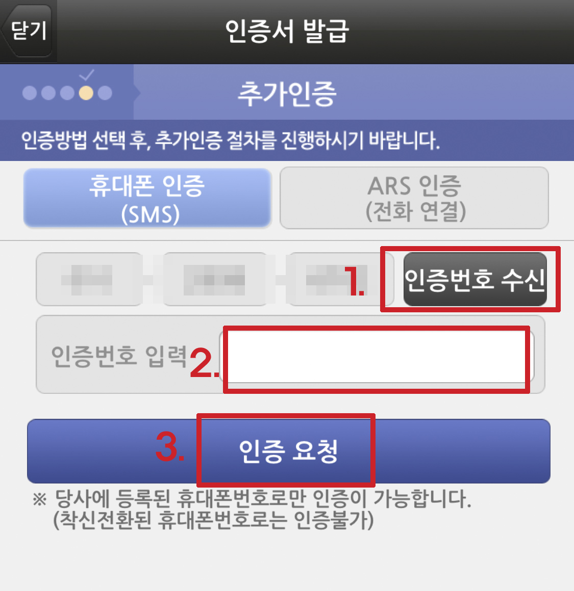 [인증번호 수신]을 클릭 후 문자메세지로 도착한 인증번호를 입력 후 [인증요청]을 클릭한다.