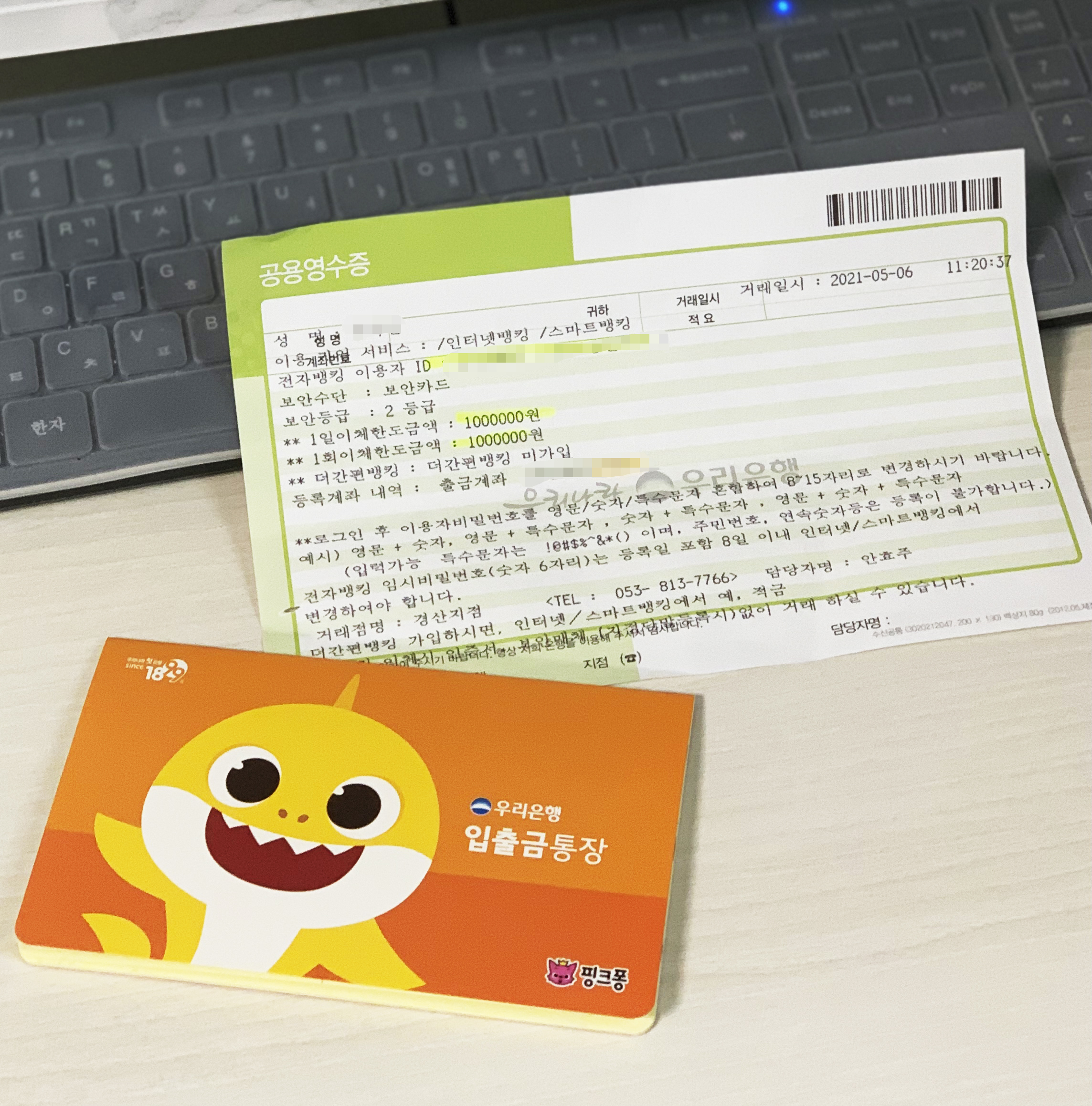 은행 창구에 앉아서 우리은행상품 리플렛을 보던 중 2015년 1월1일 이후 출생한 어린이에게 1만원 바우처를 지급하는 이벤트가 있다는 걸 알게되어 둘째아이는 아기상어 통장으로 만들게 되었다.