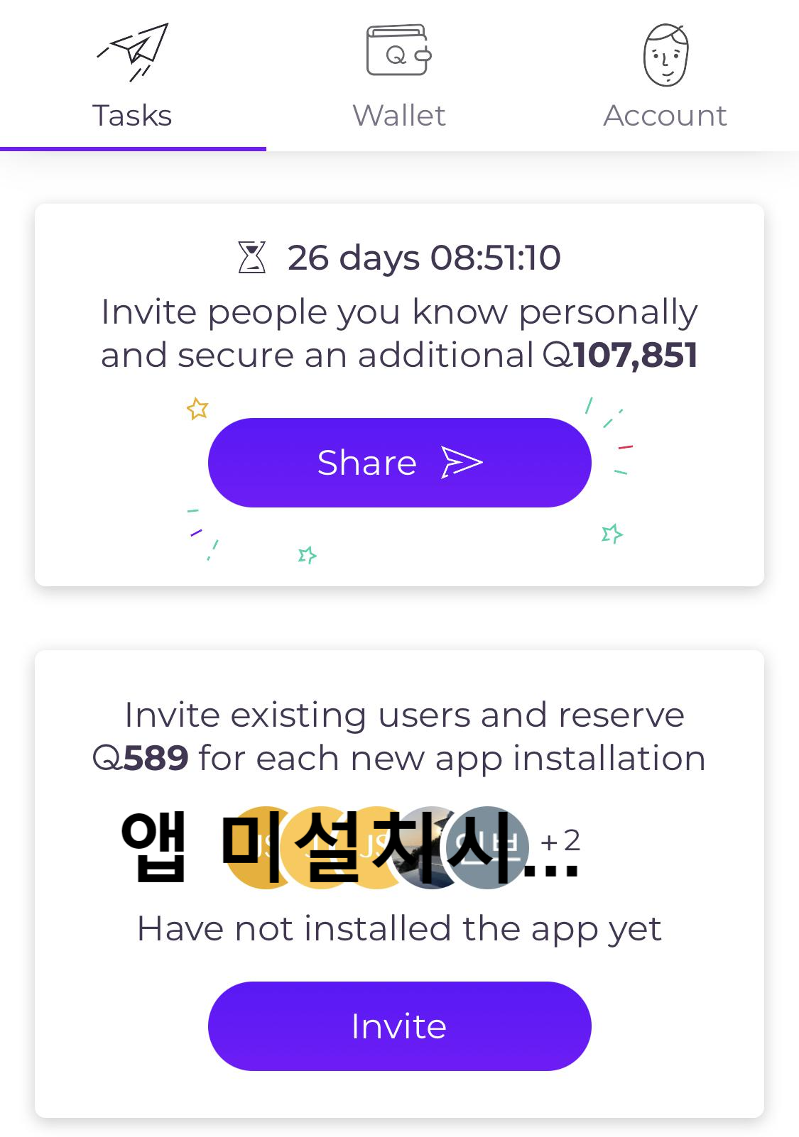 위의 파란색 share버튼을 통해 가입링크를 보내줄수 있고, 아래의 Invite를 통해 앱 가입 링크를 전달 할 수 있다.