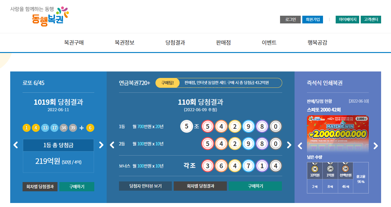 제일 왼쪽에서 로또의 회차별 당첨결과와 구매하기가 가능하고, 연금복권720+ 역시 당첨자 인터뷰 보기와 회차별 당첨결과 구매하기가 가능하다.