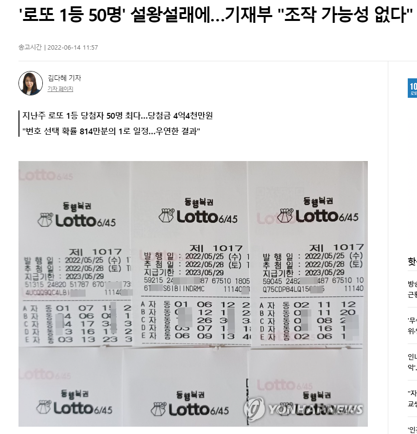 2022.6.11. 1019회차 로또 1등 당첨자가 무료 50명이나 나왔다.