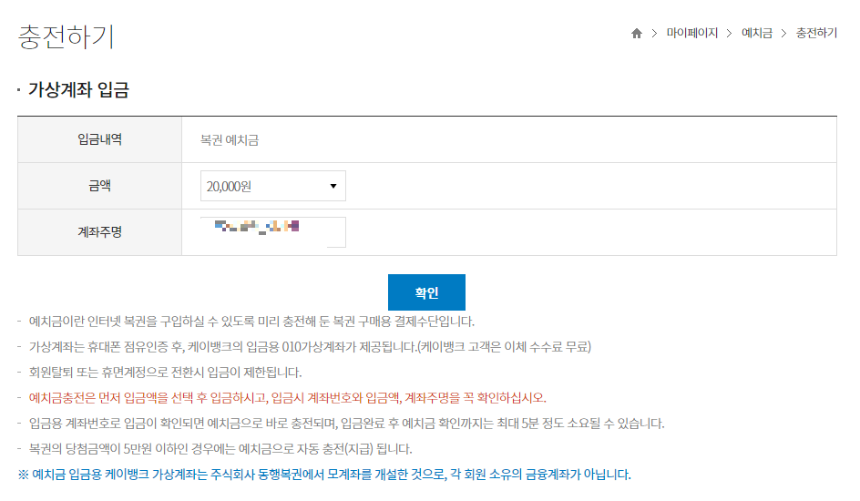 충전하기 버튼을 클릭하고 금액을 선택 후 확인 버튼을 누르면 휴대폰 인증 후 가상계좌를 받을 수 있다.