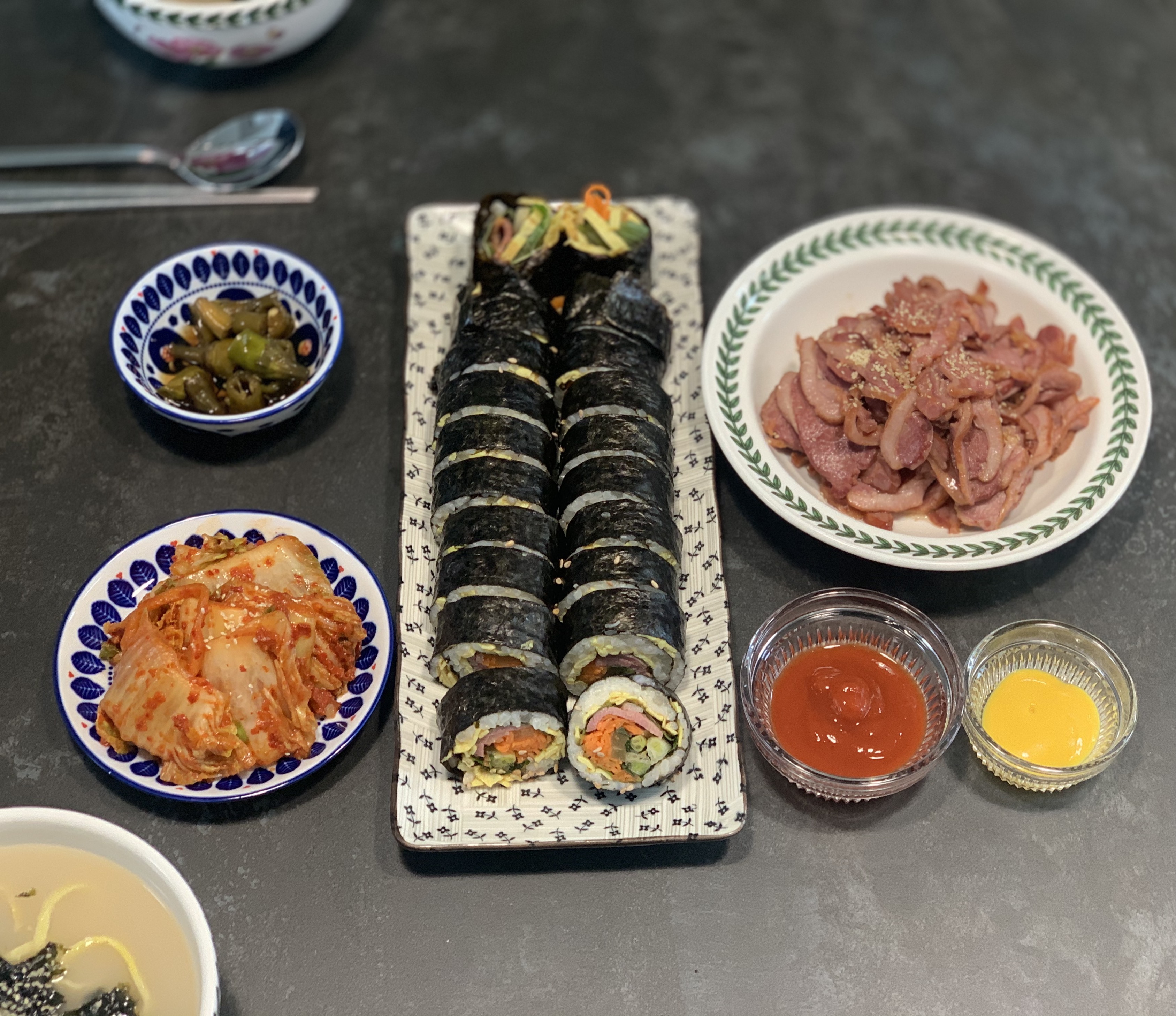 곤약쌀과 백미를 섞어 지은 밥으로 다이어트 김밥도 만들고 마지막 남은 훈제오리를 구워주었다.