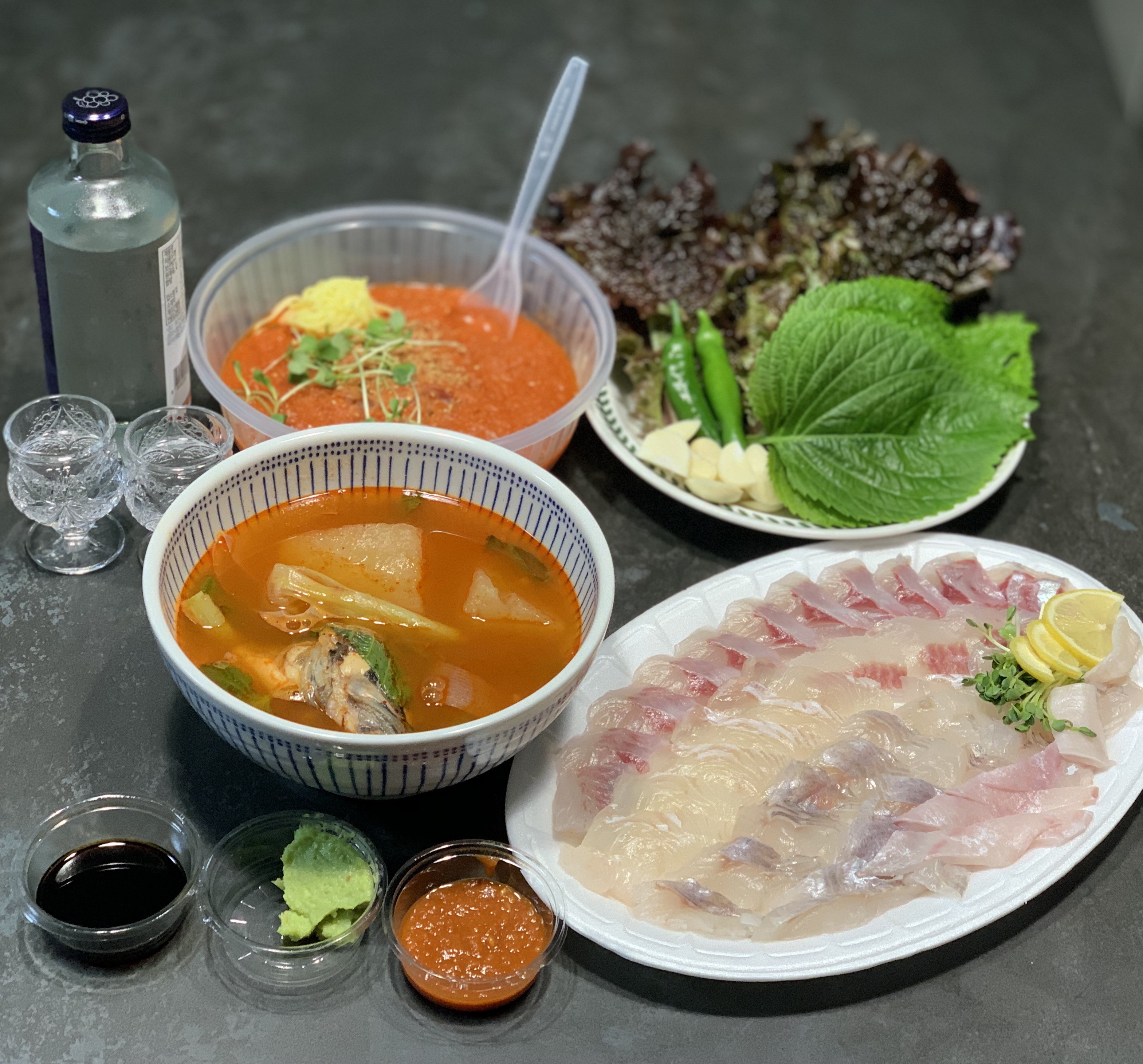모둠회 세트 하나에 매운탕과 물회가 함께 온다.