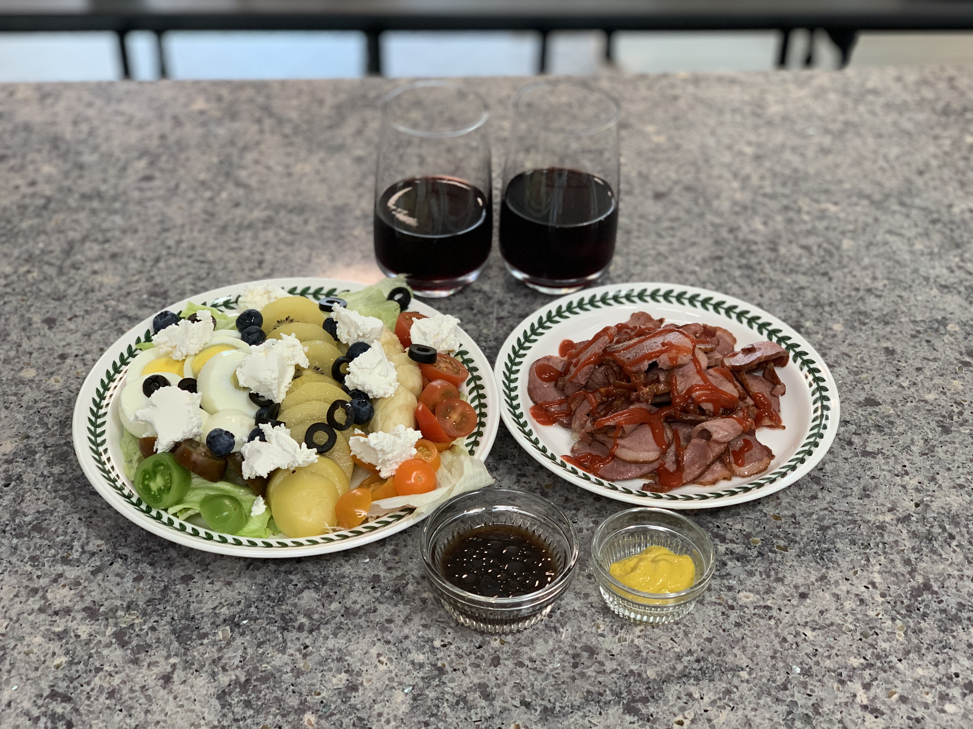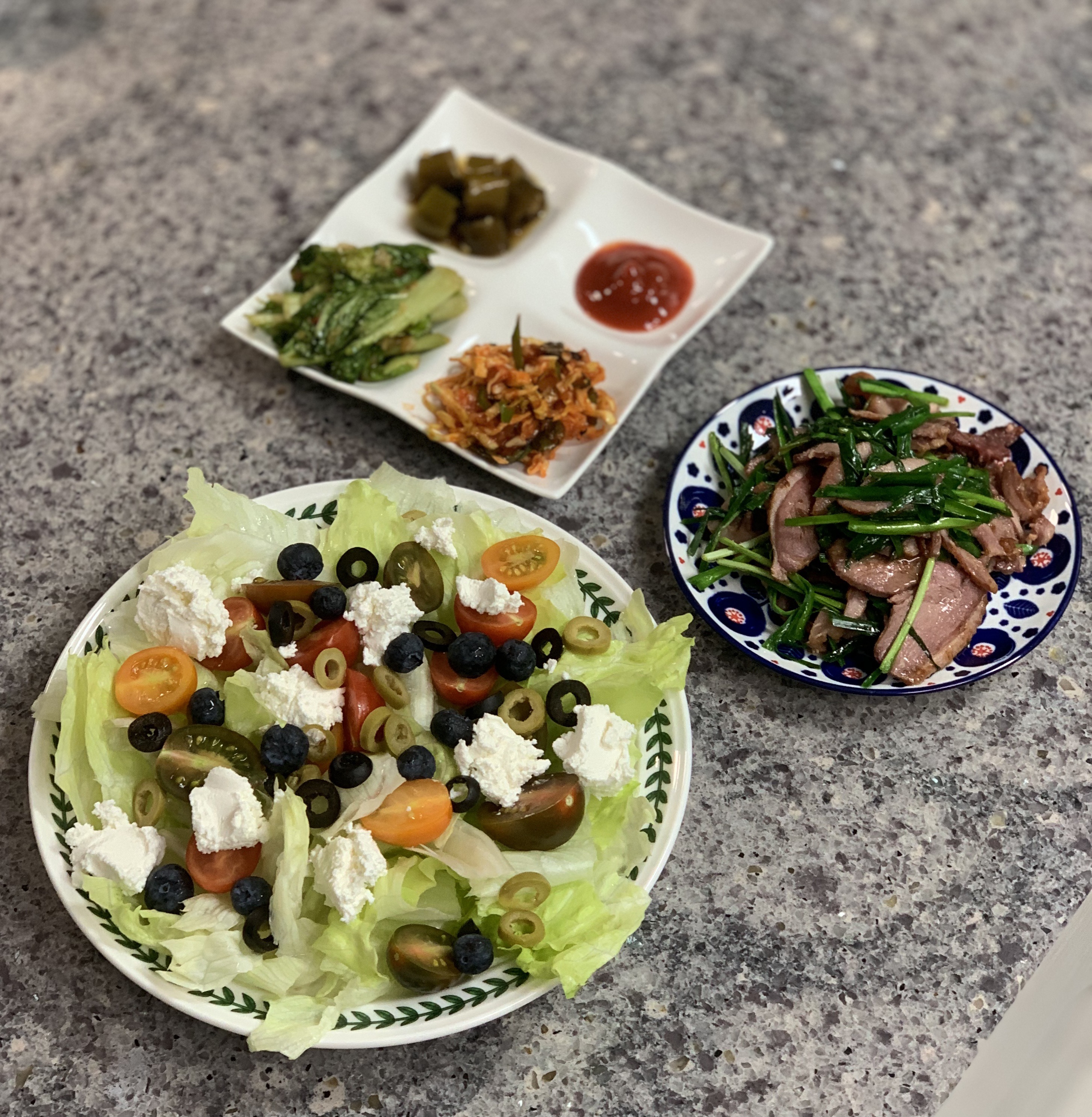 우리는 간단히 리코타 치즈 샐러드와 훈제오리.