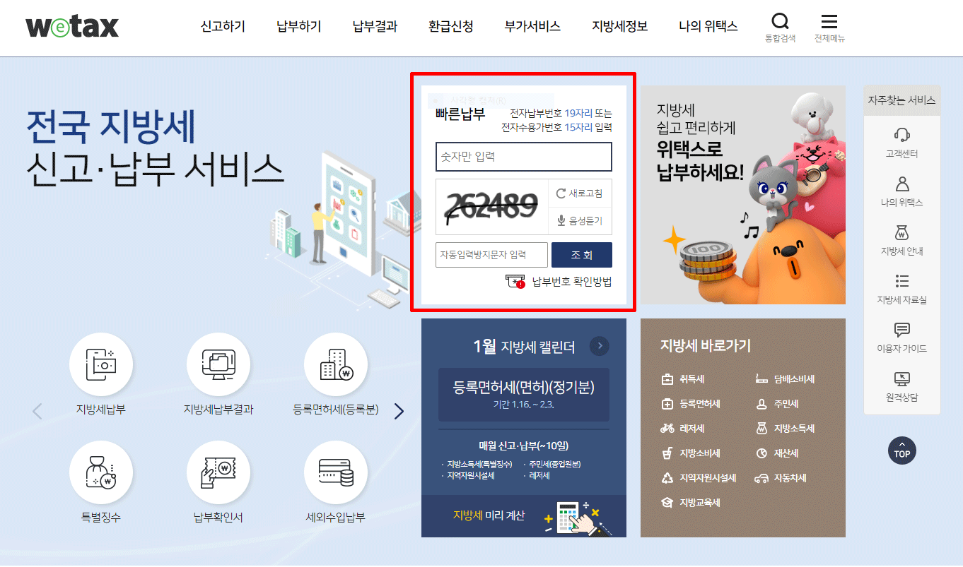 위택스 홈페이지에 들어가면 전자납부번호만 있다면 바로 납부가 가능한 [빠른납부]를 확인 할 수 있다.