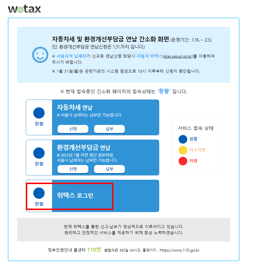 위택스에 접속하게 되면 현재는 자동차세 납부 기간으로 위와같은 화면을 볼수 있다.