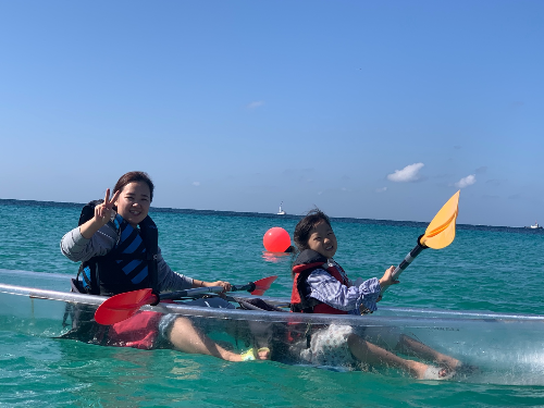 투명카약은 두사람이 같이 노를 저어야 하는데, 첫날의 전통배에서 재미를 본 우리 통통이도 너무 신나했다.