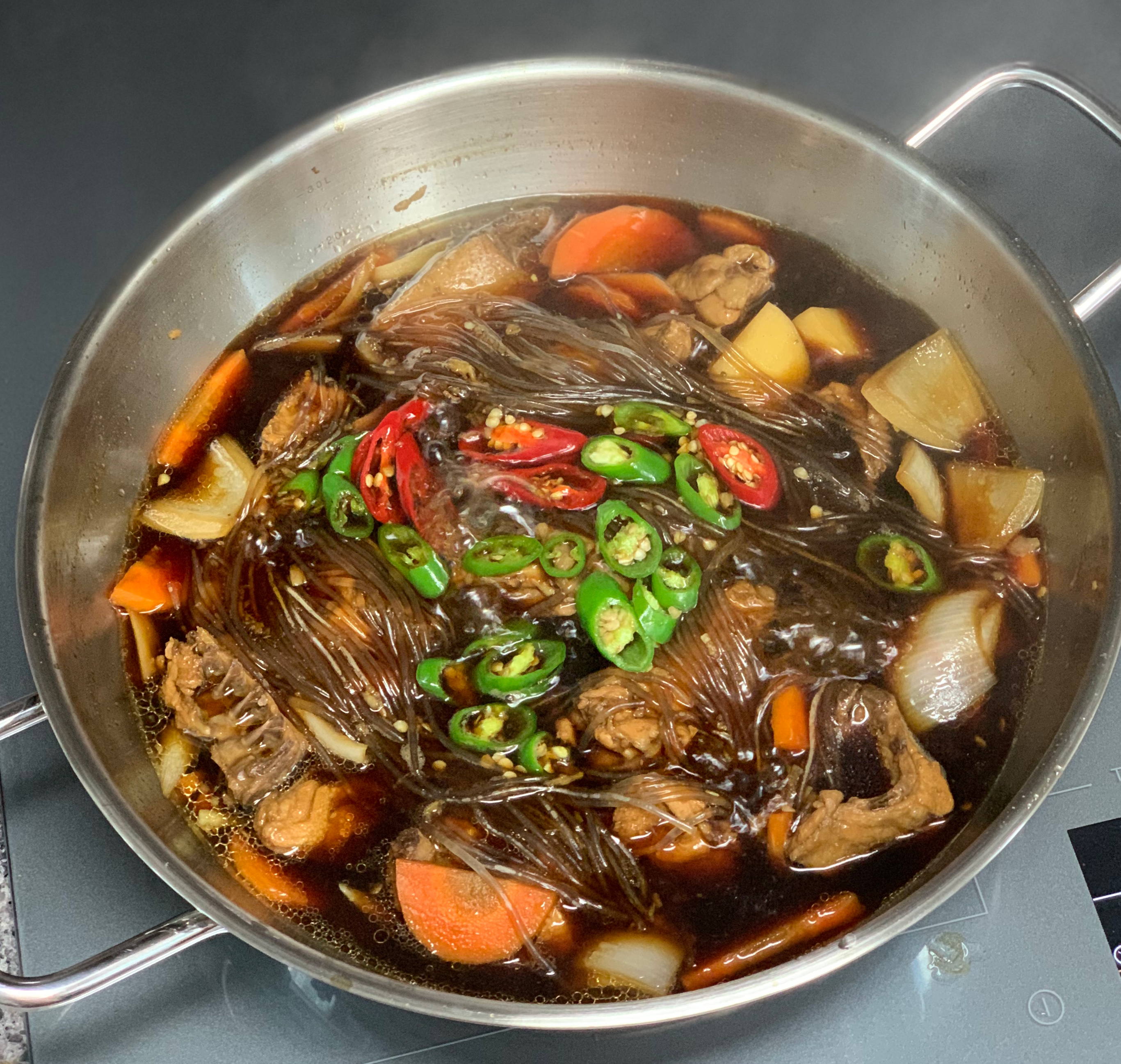 남은 냄비에는 다진 마늘 1큰술과 당면을 넣어주고 청양고추를 올려주었다.