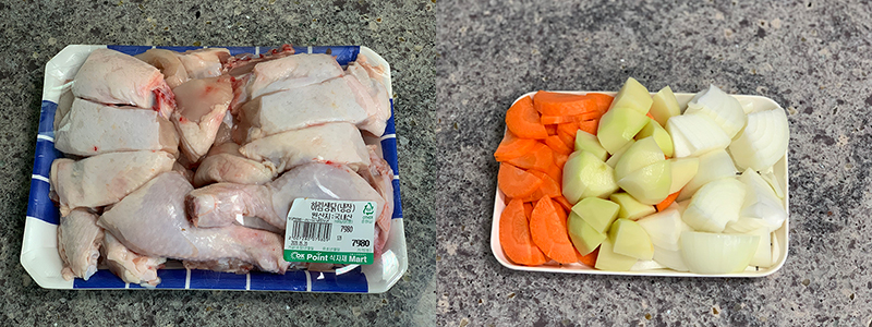 주재료 : 손질된 생닭 1마리, 당근 반개, 감자 2개, 양파 1개, 자른 당면