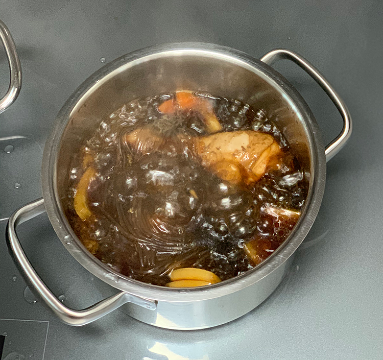 냄비에 물이 끓기 시작하면 손질된 닭을 넣고 월계수 잎과 마늘을 넣어 준다.