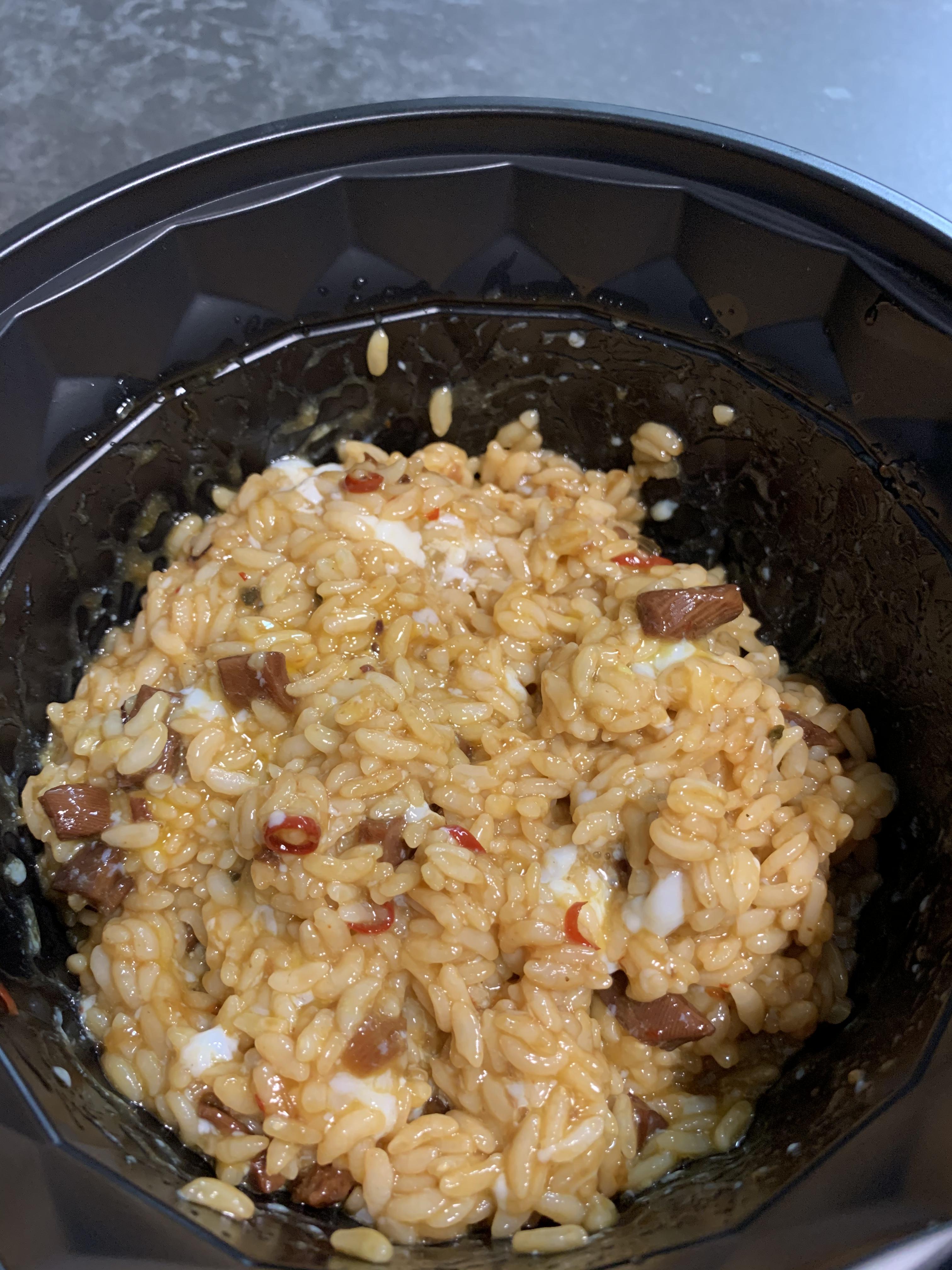2. 데워진 밥과 닭고기을 컵에 넣고 마라마요와 함께 비벼준다.