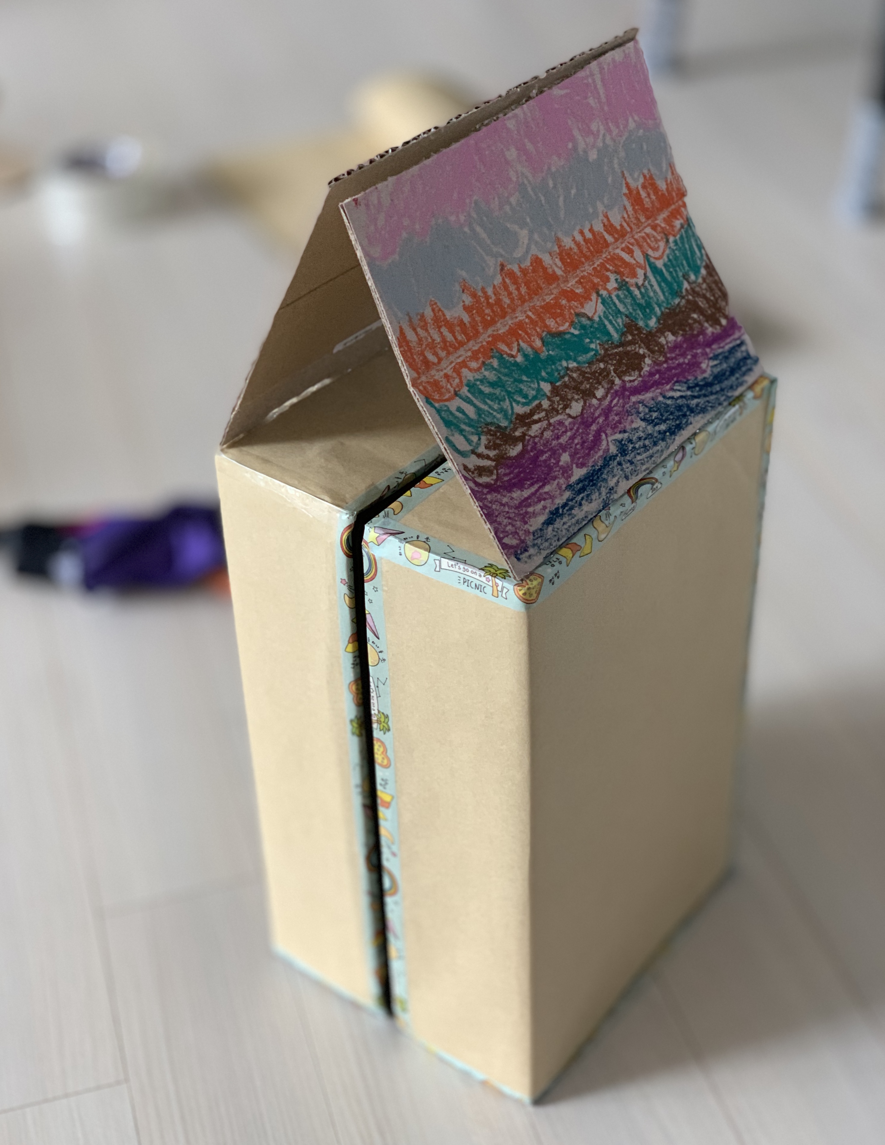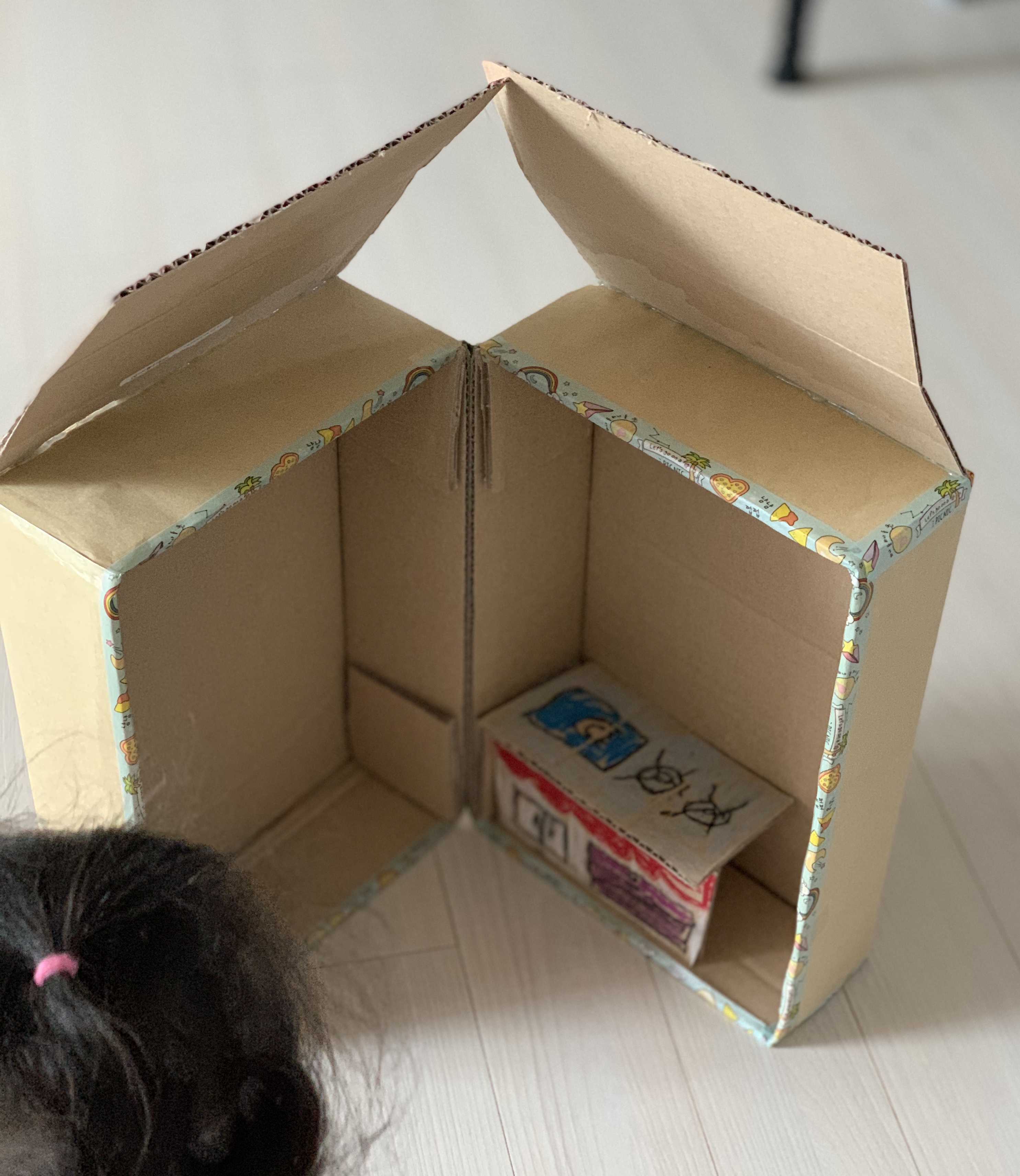 포장한 인형집에 지붕을 글루건으로 붙여주었더니 제법 근사해졌다.
