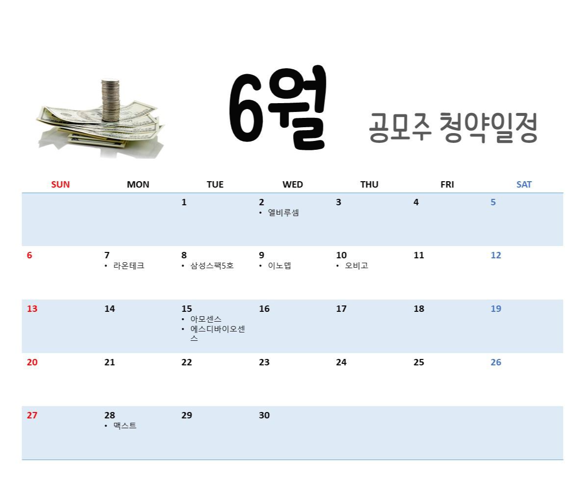 21년 6월에는 총 8건의 공모주가 청약예정이고, 상장일은 엘비루셈(6.11)을 제외하고는 미정이다.
