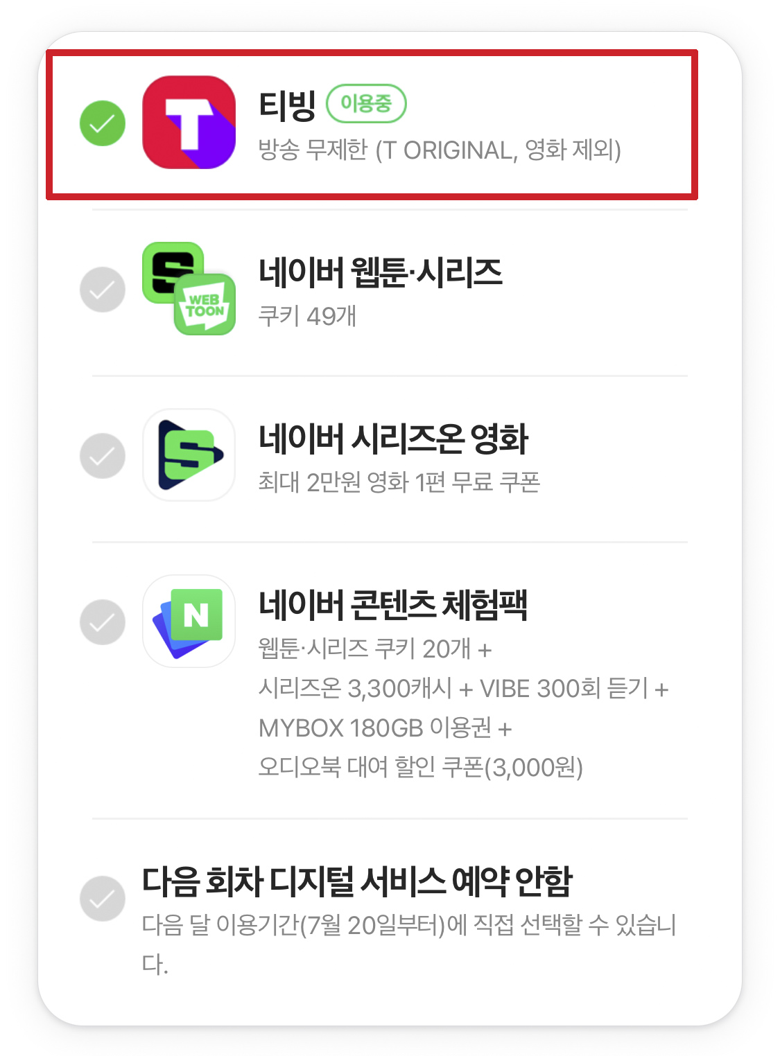현재 나는 이용 중임으로 티빙(TVING) 사용중으로 확인이 되는데, 빨간 박스 안 [다음달 서비스 변경 예약>]을 클릭하면 다른 서비스 내용 확인이 가능하다.