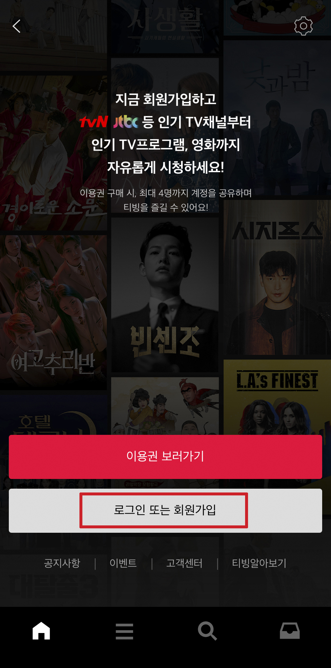 5. 티빙앱을 다운로드 후 로그인 또는 회원가입 버튼을 클릭한다.